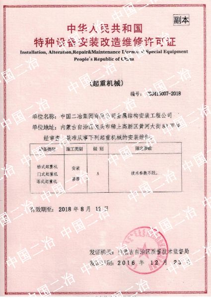 中華人民共和國特種設備安裝改造維修許可證(起重機械)
