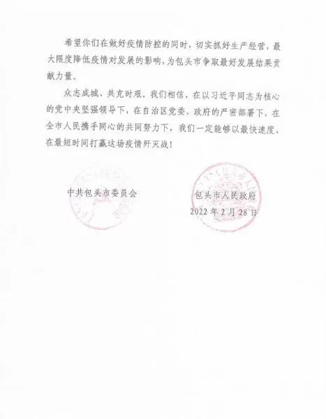 2月23日,中國二冶向包頭市人民政府遞交了《關于全力參與我市抗疫阻擊戰的請愿書》并表示,作為駐包建筑央企,中國二冶在做好自身防疫,統籌生產經營,保持經濟穩增長的同時,誠愿積極響應市委市政府號召,勇擔使命,沖鋒在前,主動參與到各項疫情防控重點工作中。如市政府有緊急抗疫任務,或應急設施建設任務。中國二冶將第一時間,迅速行動,調集駐包單位各方面資源力量,充分發揮建筑企業的特點和優勢,全力以赴為我市疫情防控貢獻央企力量。